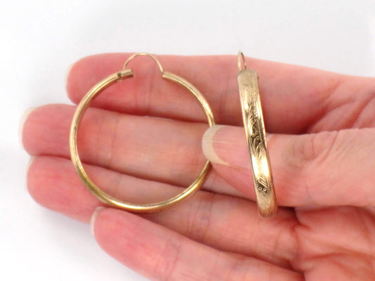Vintage Gold Tone Round Floral Etched Hoop Earrings, 1 3/8" Circa 1950s
