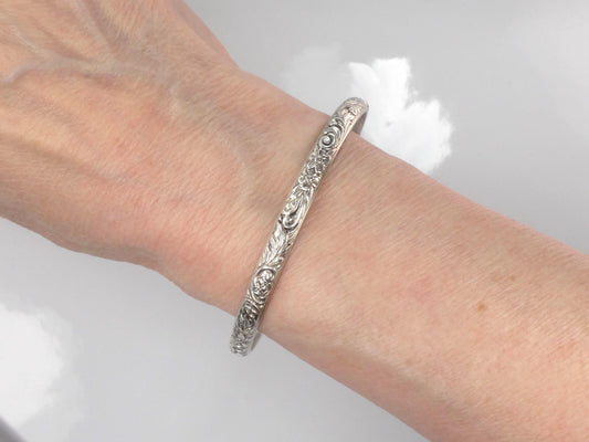 Vintage Sterling Silver Floral Bangle Bracelet: Slip On Style