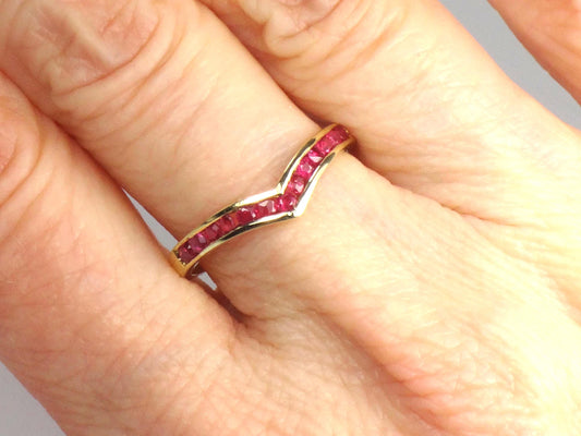 Vintage 14k Yellow Gold Ruby Ring, Chevron Wedding Band or Stacking, Size 6.5
