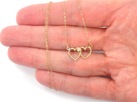 Vintage Dainty 14k Gold Diamond Double Heart Necklace 17.5"