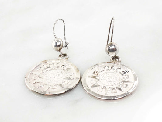Vintage Sterling Silver Aztec Sun Calendar Earrings - Mayan Discs