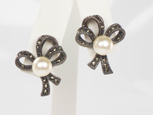 Vintage Marcasite Bow Earrings: Silver Imitation Pearl Studs