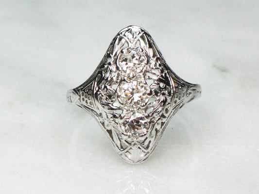 Antique 14k White Gold Diamond Filigree Ring: Art Deco Three-Stone Ring, Size 7