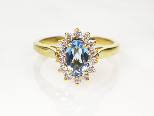 Vintage 18k Yellow Gold Aquamarine Diamond Halo Ring - Size 6