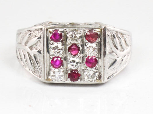 Vintage 14k White Gold Diamond & Ruby Men's Ring - Size 12.25