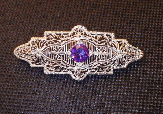 Vintage Art Deco Amethyst Pendant Pin: 14k White Gold Filigree