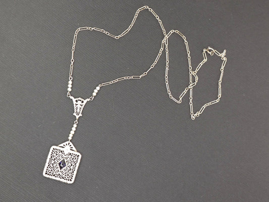 Vintage Art Deco Sapphire Necklace: 14k White Gold, Platinum, Diamond, Pearl Filigree