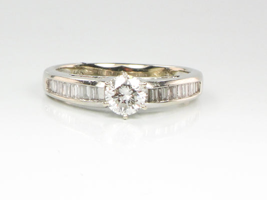 Vintage 14k White Gold Natural Round Diamond Engagement Ring with Baguettes, Approximately .85 Carats TDW