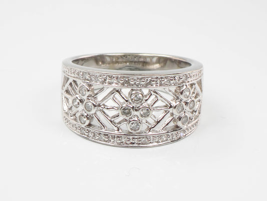 Vintage Wide 14k White Gold Diamond Ring with Fancy Cut Outs, Size 7