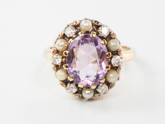 Vintage 14k Yellow Gold Pink Amethyst, Diamond and Pearl Halo Ring, Size 7 February Birthstone Ring