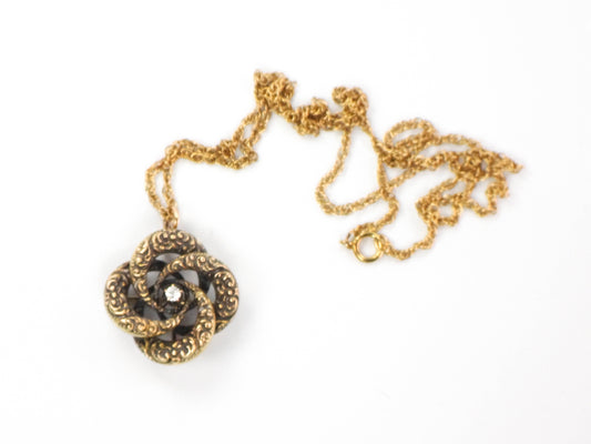 Victorian 14k Gold Old Mine Cut Diamond Love Knot Pendant Necklace 20" Antique Pin