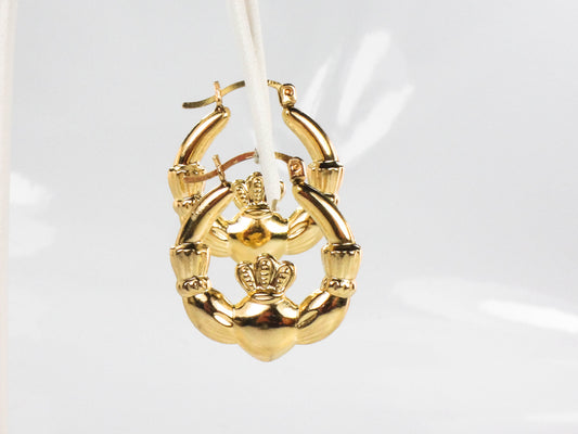 Vintage 14k Yellow Gold Claddagh Hoop Earrings, Irish Symbol Earrings