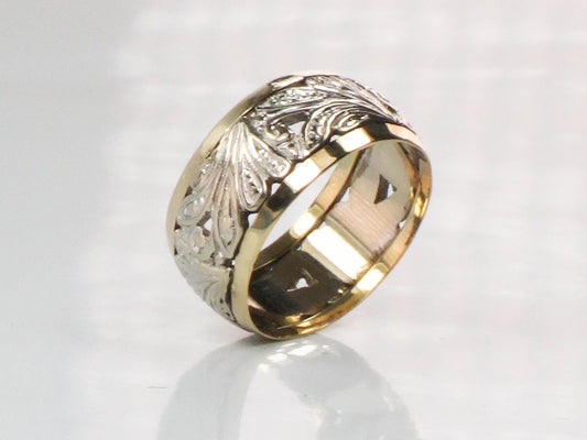 Vintage 14k Two-Tone Gold Wedding Band: Floral Pierced Design, Size 6.25