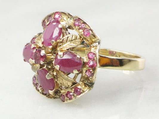 Vintage 14k Yellow Gold Ruby Ring: Floral, Red Spinel Accent Ring