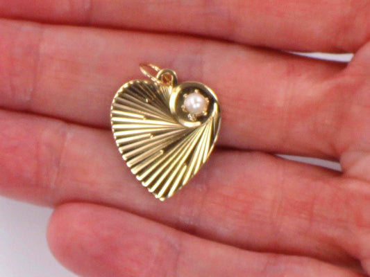 Vintage 14k Gold Heart Pendant: Pearl and Sunburst Design
