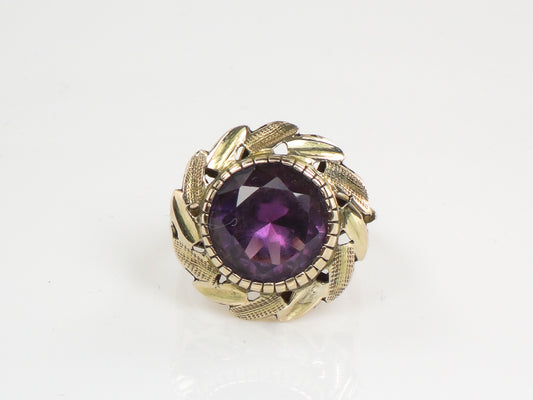 Vintage 14k Yellow Gold Round Purple Sapphire Ring with Floral Design