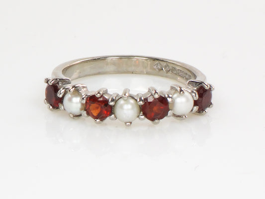 Vintage 14k White Gold Garnet and Pearl Ring with English Hallmarks, Wedding Band, Stacking Ring