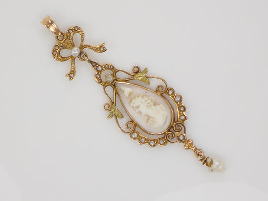 Vintage Art Nouveau 14k Gold Cameo and Pearl Bow Lavalier Pendant