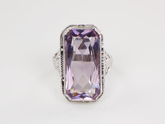 Vintage Art Deco Style 14k White Gold Rectangle Cut Amethyst Filigree Ring