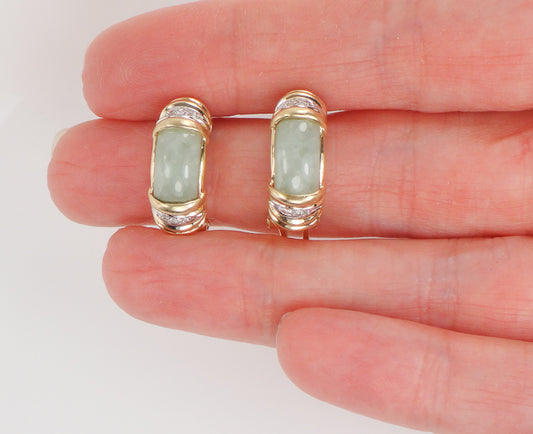 Vintage 14k Yellow Gold Chrysoprase and Diamond Earrings with Omega Backs, Light Green Jade Look Earrings