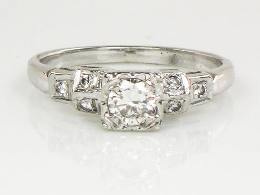 Vintage Art Deco Style 14k White Gold Transitional European Cut Diamond Engagement Ring, Size 5.75