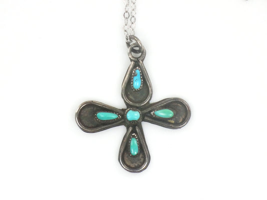 Vintage Long Sterling Silver Native American Style Turquoise Cross Necklace 25"