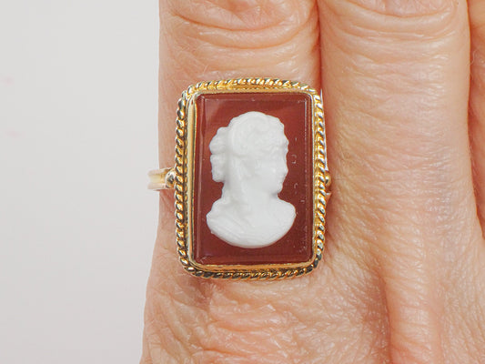 Vintage 14k Yellow Gold Hardstone Cameo Ring, Carved Stone Fine Jewelry, Size 8.25