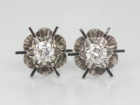 Vintage 14k White Gold Natural Diamond Stud Buttercup Earrings, Round Brilliant Bridal Earrings