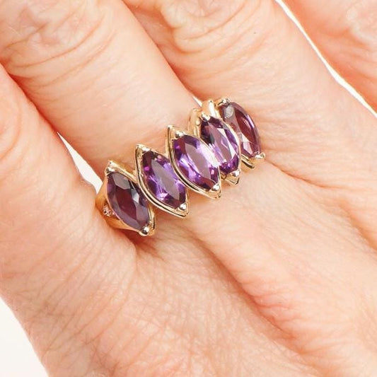 10k Yellow Gold Marquise Natural Amethyst Ring, Vintage Purple February Birthstone Ring, Size 9