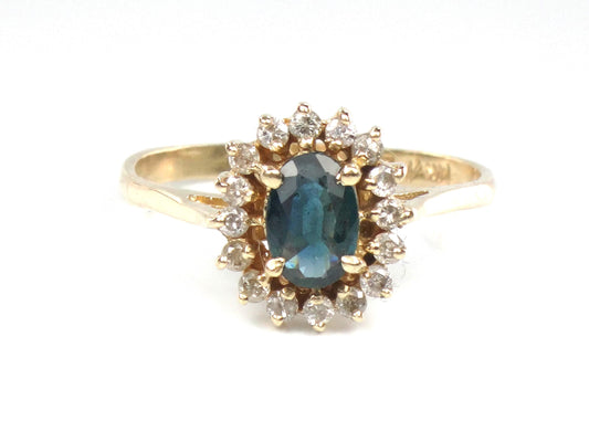 Vintage 14k Yellow Gold Sapphire Diamond Halo Ring - September Birthstone - Size 6.75
