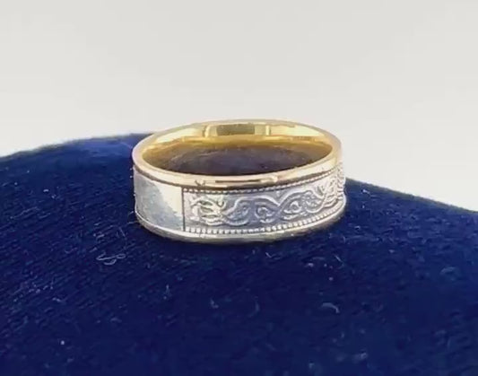Vintage 10k Gold Irish Wedding Band: Two-Tone Celtic Warrior Shield Ring, Size 7