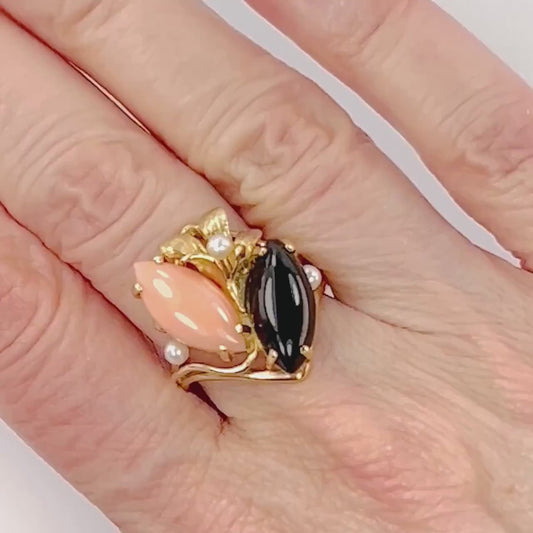 Vintage 14k Gold Angel Skin Coral, Onyx & Pearl Ring: Floral, Size 6.5