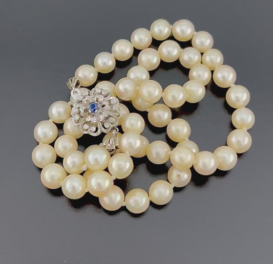 Vintage 18k White Gold Pearl Necklace: Sapphire Floral Clasp, 19" Bridal Strand