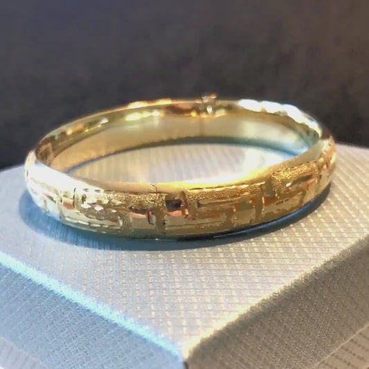 Vintage 14k Yellow Gold Greek Key Design Hinged Bangle Bracelet, Size 6 7/8"