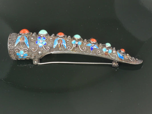 Vintage Silver Finger Nail Cover Pin: Turquoise, Coral, Enamel Floral Design
