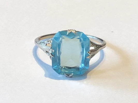 Vintage Art Deco Antique 14k White Gold Filigree Blue Glass Ring Size 8.25