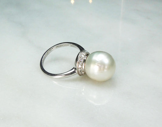 Vintage Palladium South Sea Pearl Ring: Diamond Halo, Bridal Statement