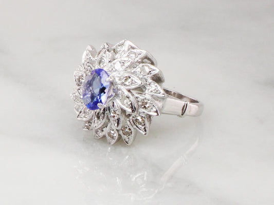 Vintage 14k White Gold Tanzanite Diamond Floral Cocktail Ring