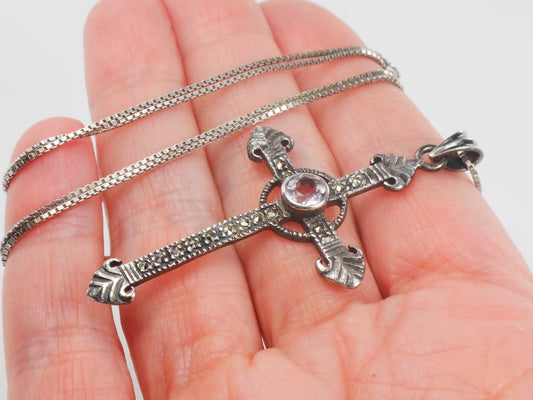 Estate Sterling Silver Large Purple Amethyst and Marcasite Cross Pendant Necklace 24"