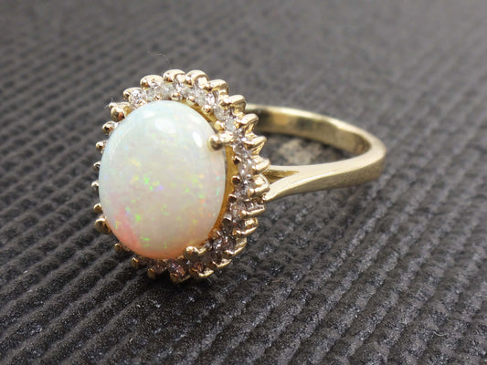 Vintage Australian Opal Ring: 14k Yellow Gold Diamond Halo, October Birthstone