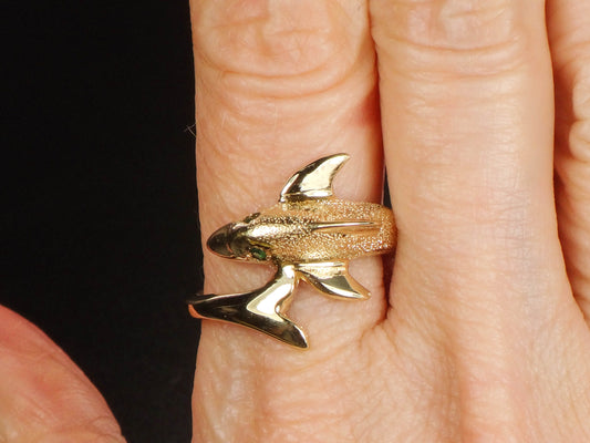 Vintage 14k Yellow Gold Dolphin Ring: Emerald Eyes, Nautical Jewelry, Size 8.5