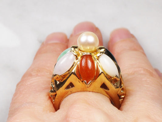 Vintage 14k Yellow Gold Cultured Pearl Onyx & Jade Dome Ring, Size 7.5