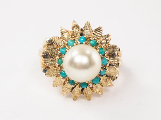 Vintage 14k Yellow Gold Pearl Turquoise Ring: Floral Design
