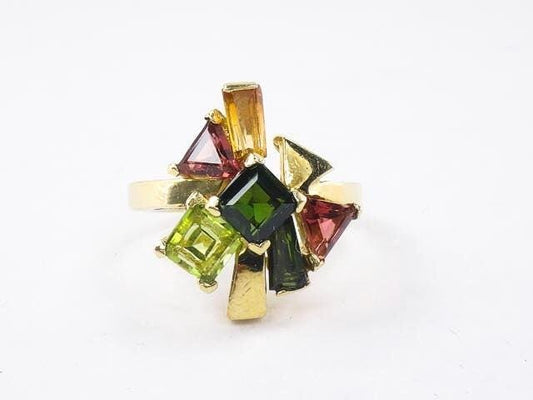 Vintage 18k Gold Multi-Gemstone Cluster Ring: Italian Tourmaline Citrine Peridot, Size 7