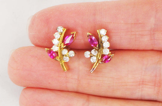 Vintage 14k Yellow Gold Ruby Diamond Floral Stud Earrings
