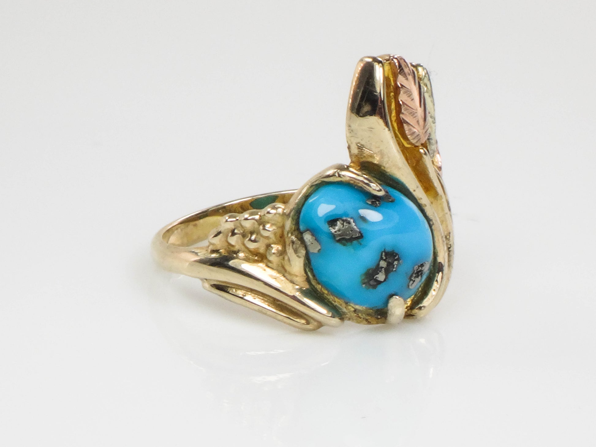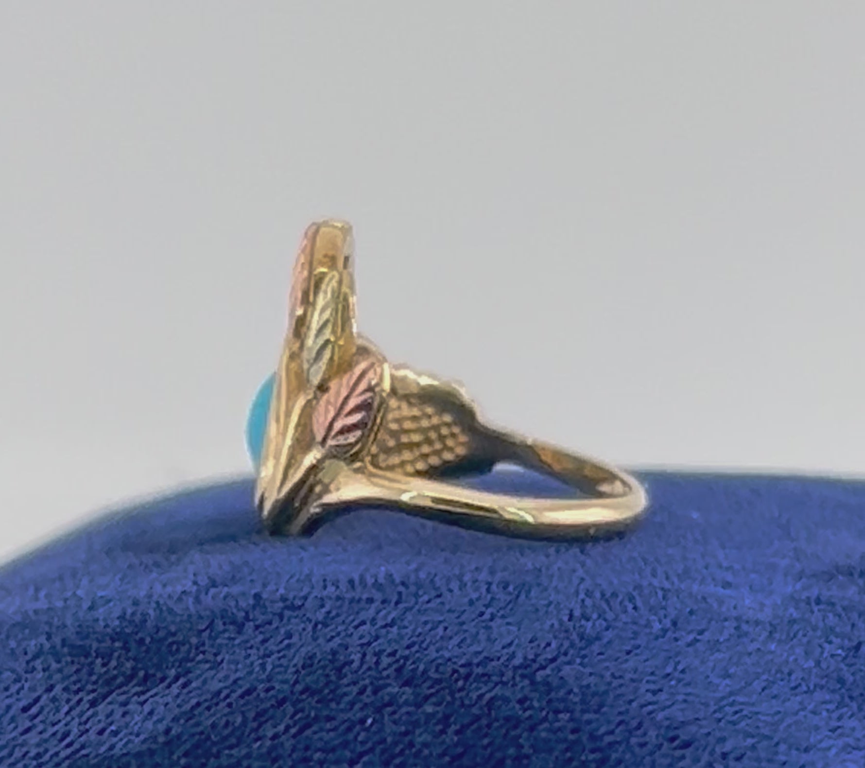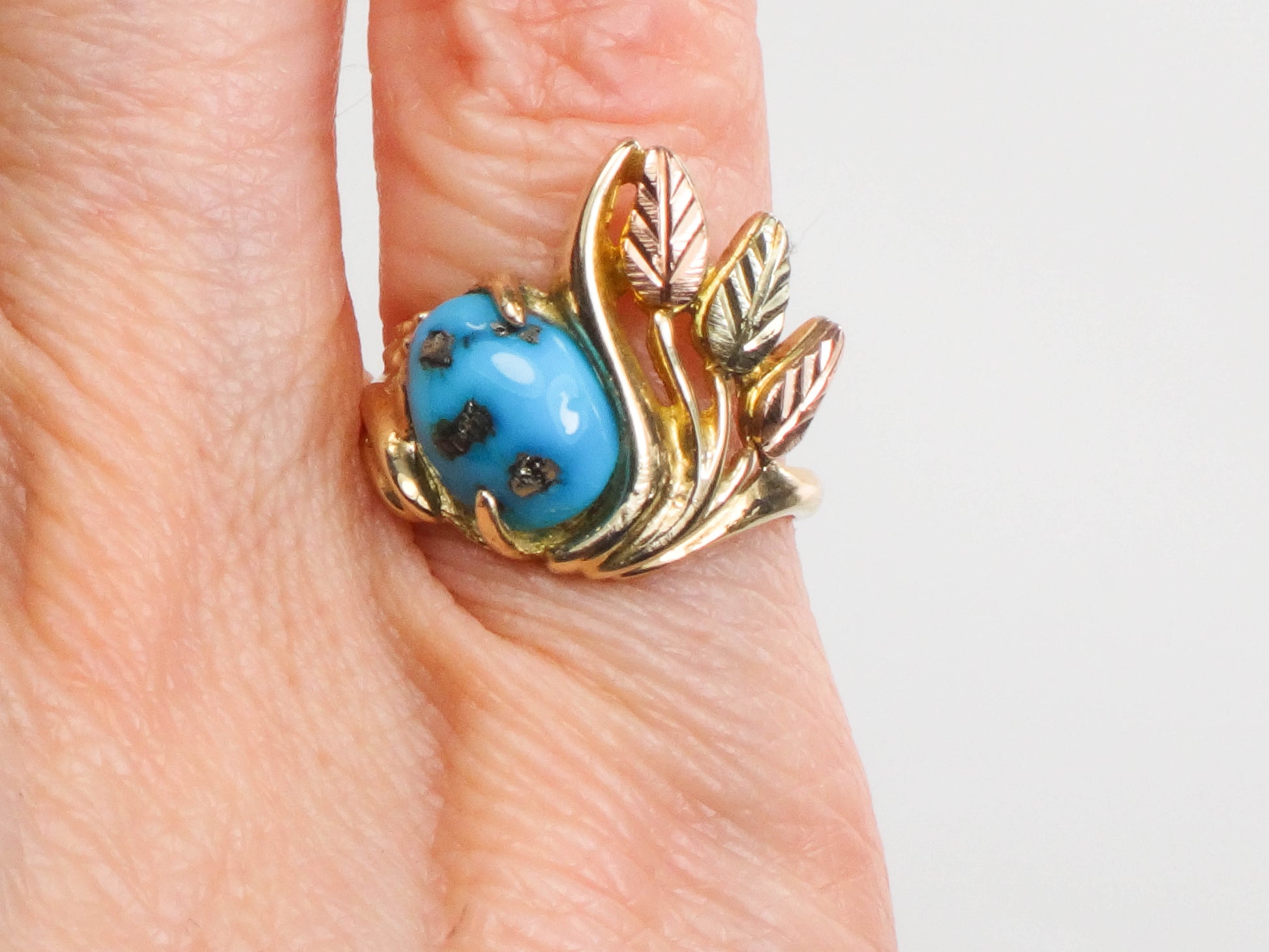Vintage 10k Yellow and Rose Gold Turquoise Ring with Leaves and Berries, Size 4