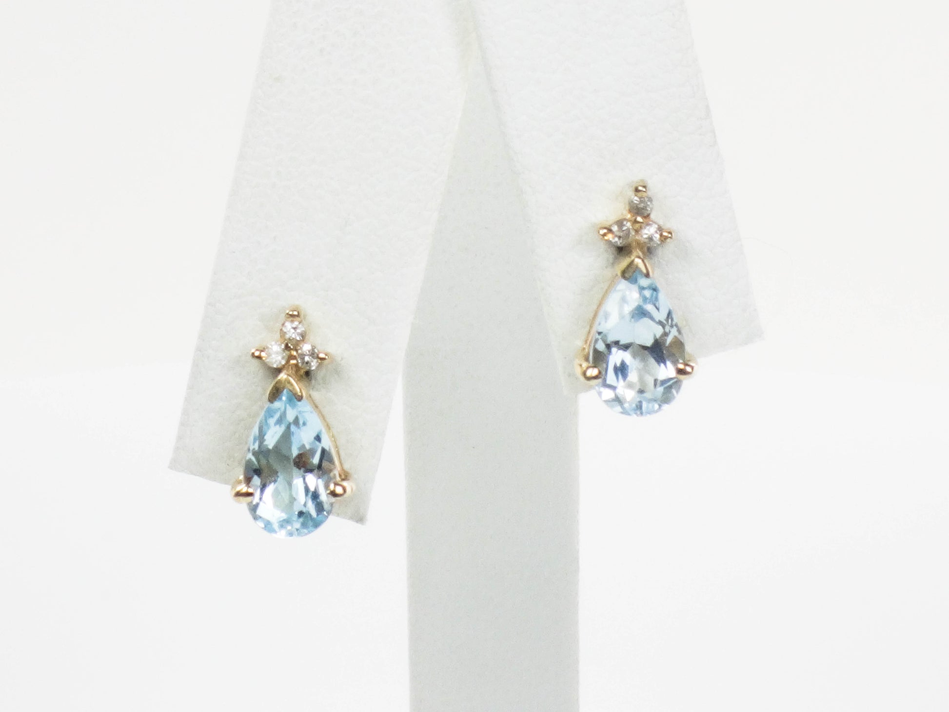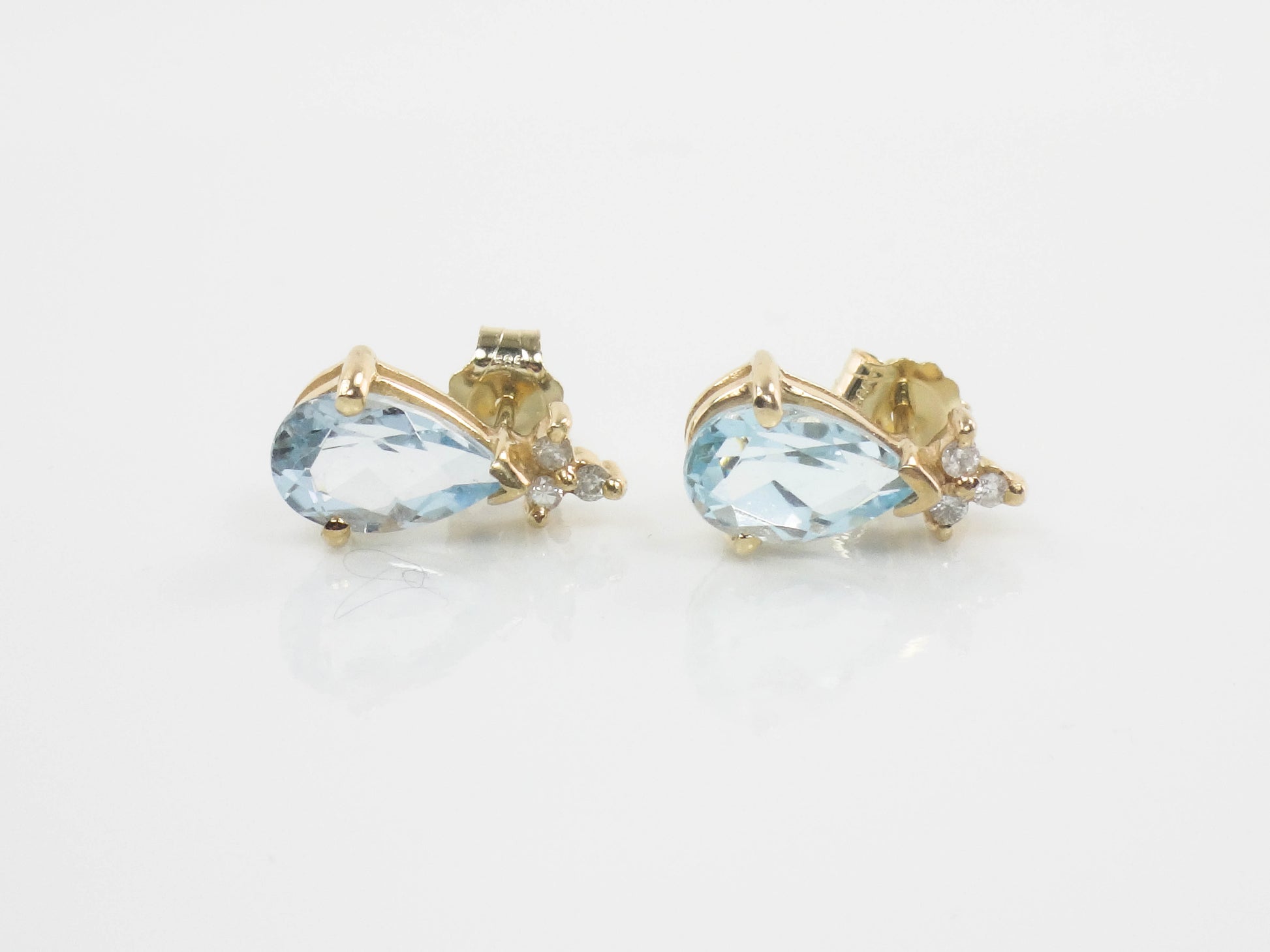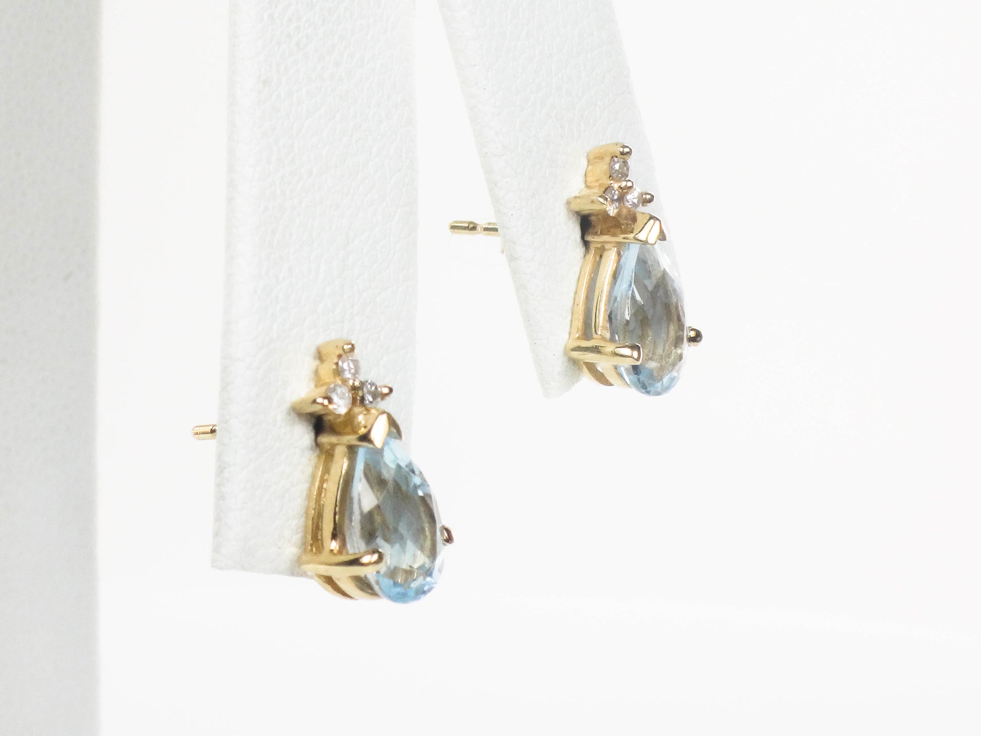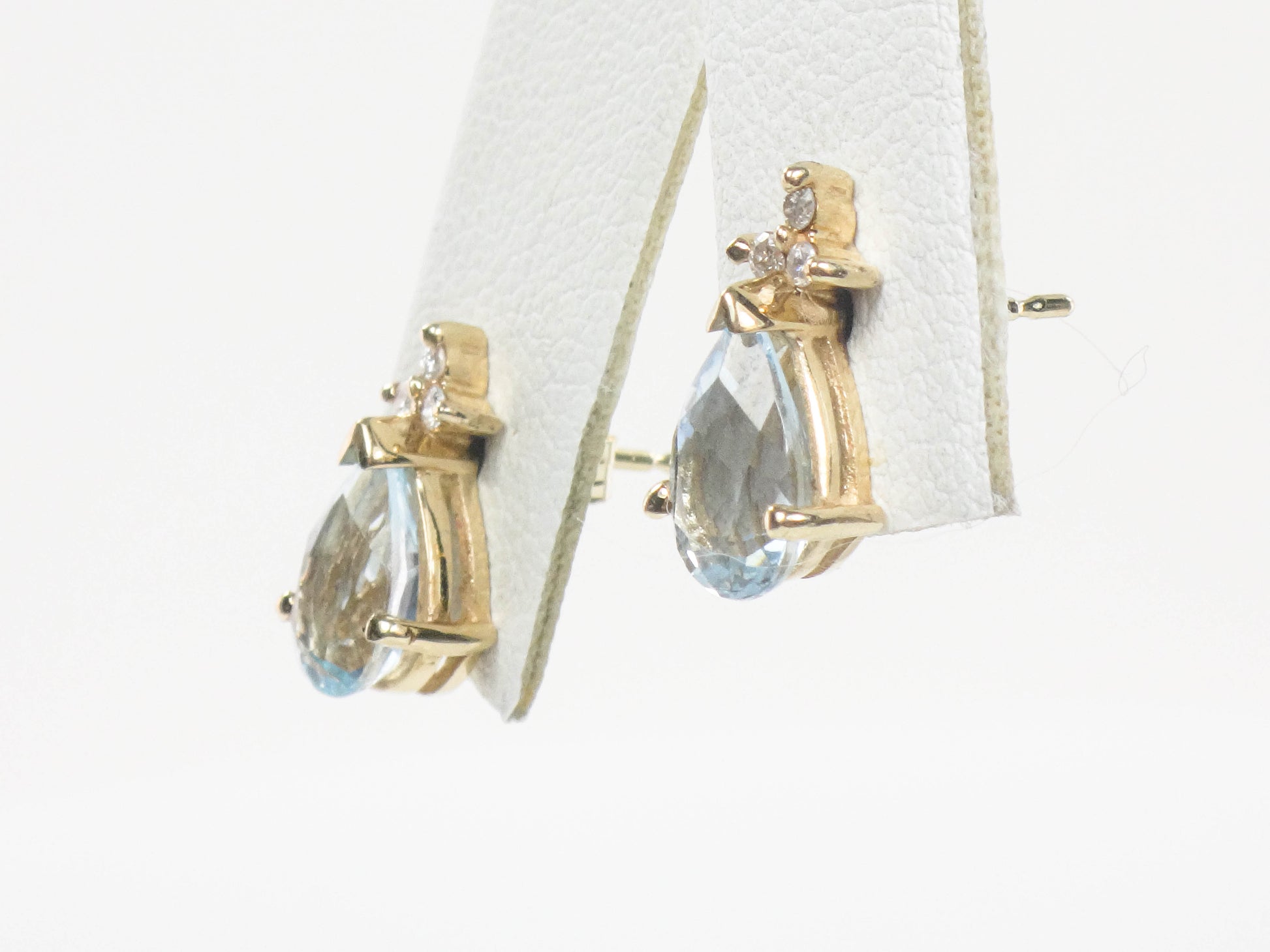 These 14k Yellow Gold Teardrop Cut Topaz and Diamond Stud Earrings have wonderful pale blue color. The light blue is reminiscent of water or the sky. Three full cut diamonds sit at the top of each earring. The diamonds weigh approximately .01 carats each. The earrings measure approximately 12.35 mm north to south and 6.25 mm east to west. The earrings have post backs that are marked 14k and the earring backs are marked 585, a mark for 14k gold. They test for 14k gold (not plated or filled). These earrings are in good estate condition and are ready to be worn and enjoyed. The perfect pair for everyday!