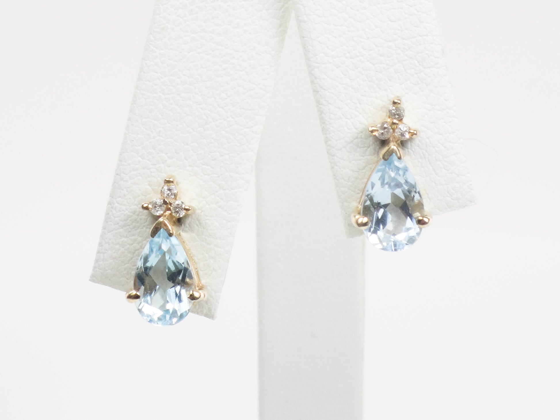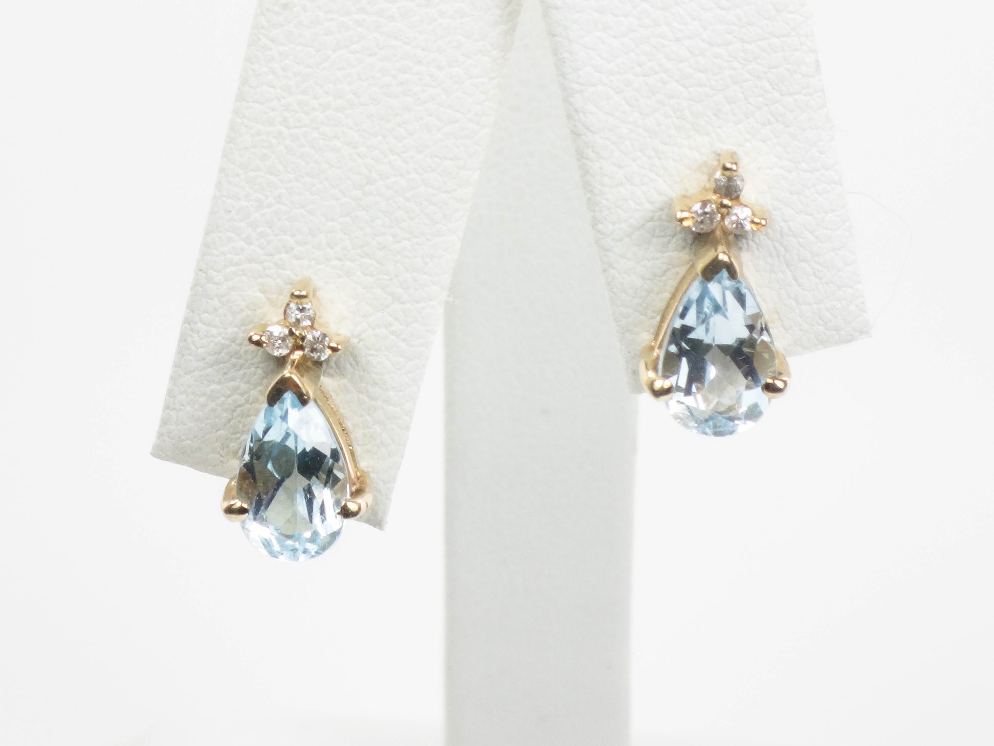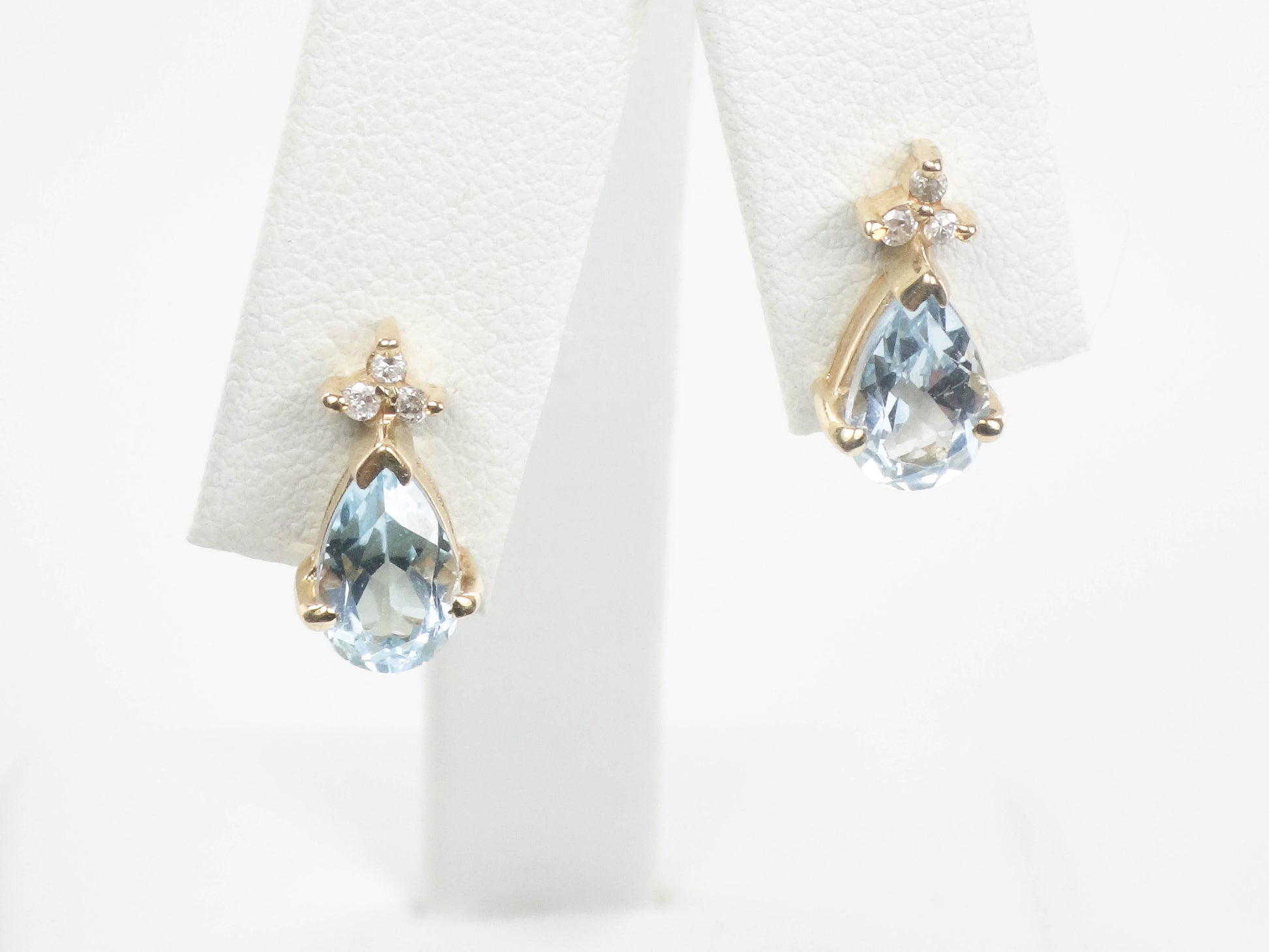 These 14k Yellow Gold Teardrop Cut Topaz and Diamond Stud Earrings have wonderful pale blue color. The light blue is reminiscent of water or the sky. Three full cut diamonds sit at the top of each earring. The diamonds weigh approximately .01 carats each. The earrings measure approximately 12.35 mm north to south and 6.25 mm east to west. The earrings have post backs that are marked 14k and the earring backs are marked 585, a mark for 14k gold. They test for 14k gold (not plated or filled). These earrings are in good estate condition and are ready to be worn and enjoyed. The perfect pair for everyday!