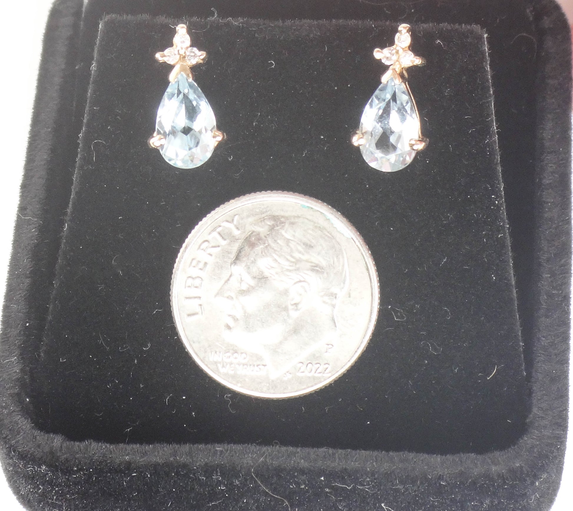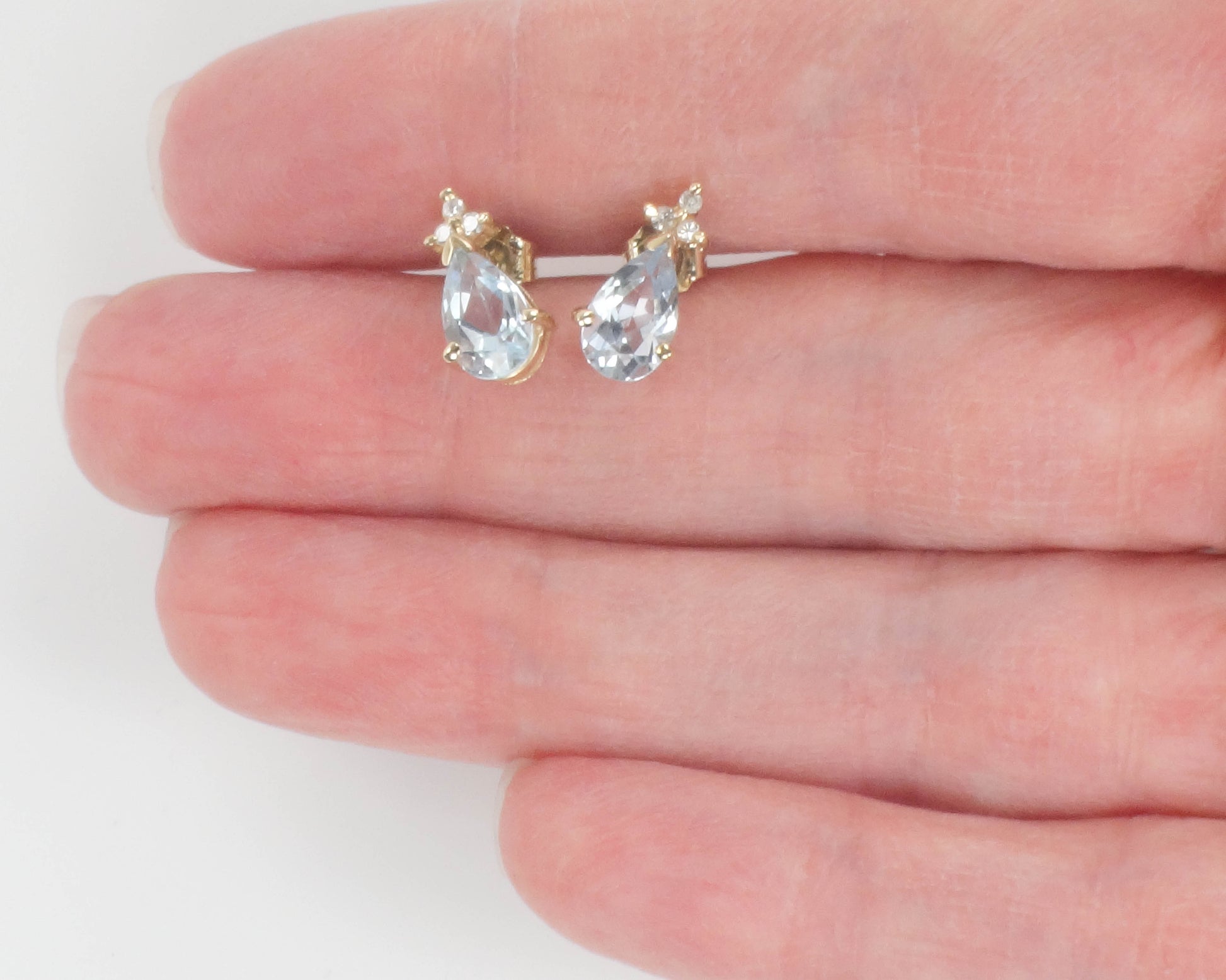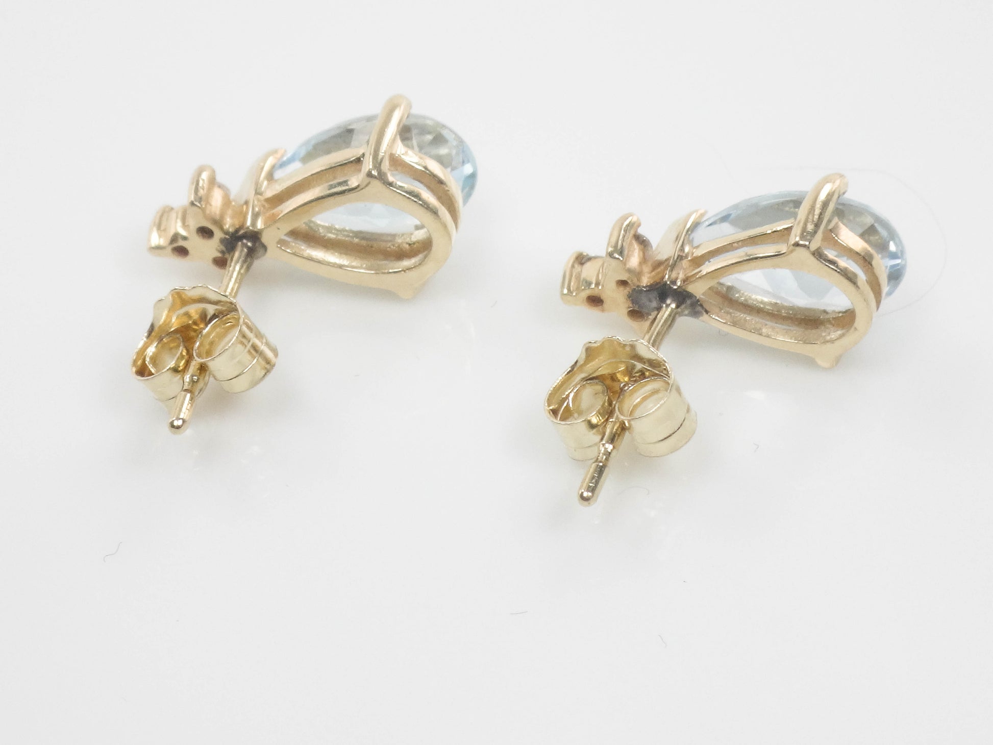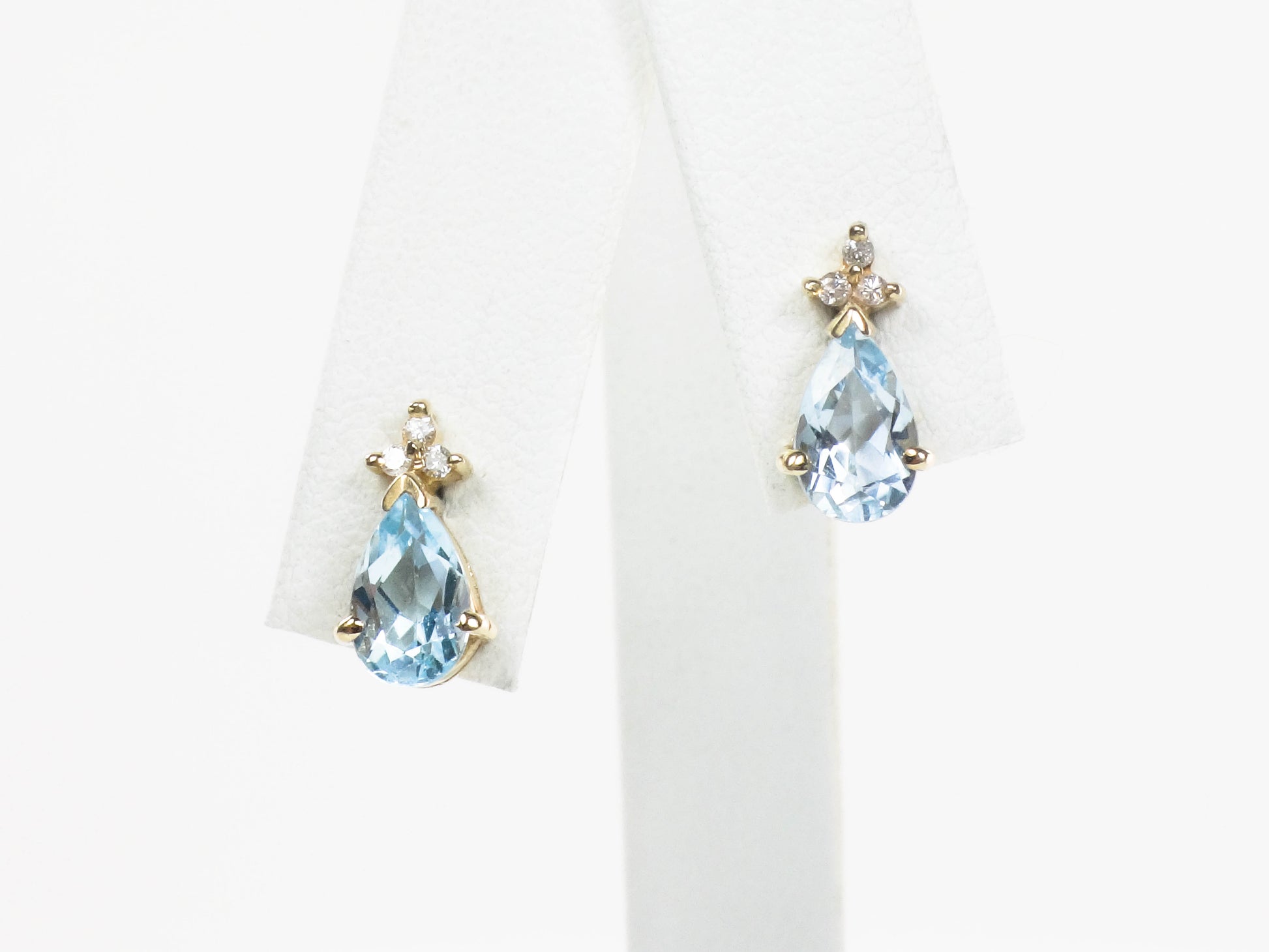 These 14k Yellow Gold Teardrop Cut Topaz and Diamond Stud Earrings have wonderful pale blue color. The light blue is reminiscent of water or the sky. Three full cut diamonds sit at the top of each earring. The diamonds weigh approximately .01 carats each. The earrings measure approximately 12.35 mm north to south and 6.25 mm east to west. The earrings have post backs that are marked 14k and the earring backs are marked 585, a mark for 14k gold. They test for 14k gold (not plated or filled). These earrings are in good estate condition and are ready to be worn and enjoyed. The perfect pair for everyday!