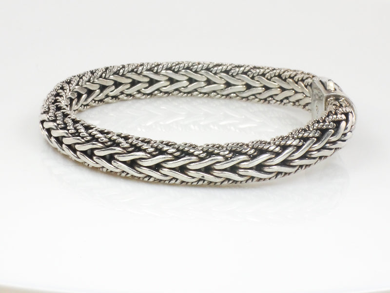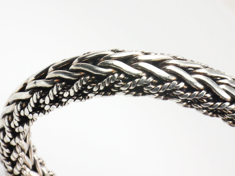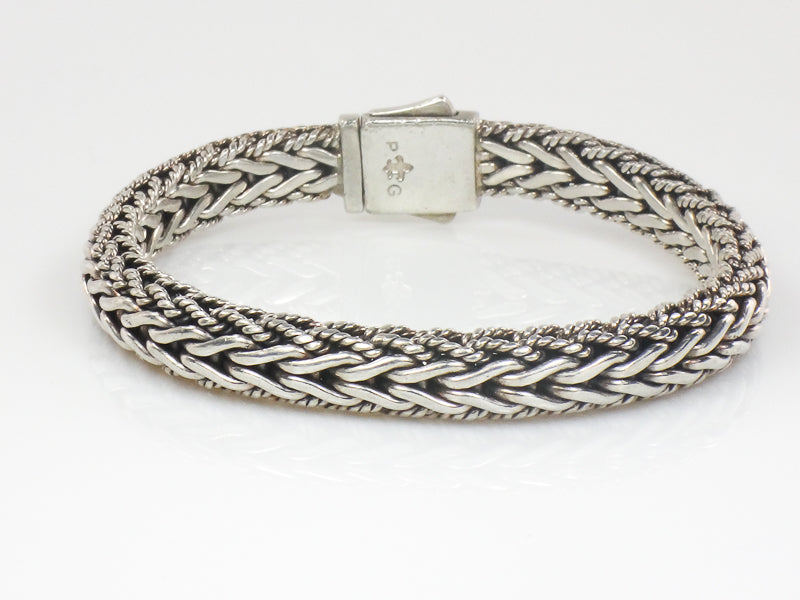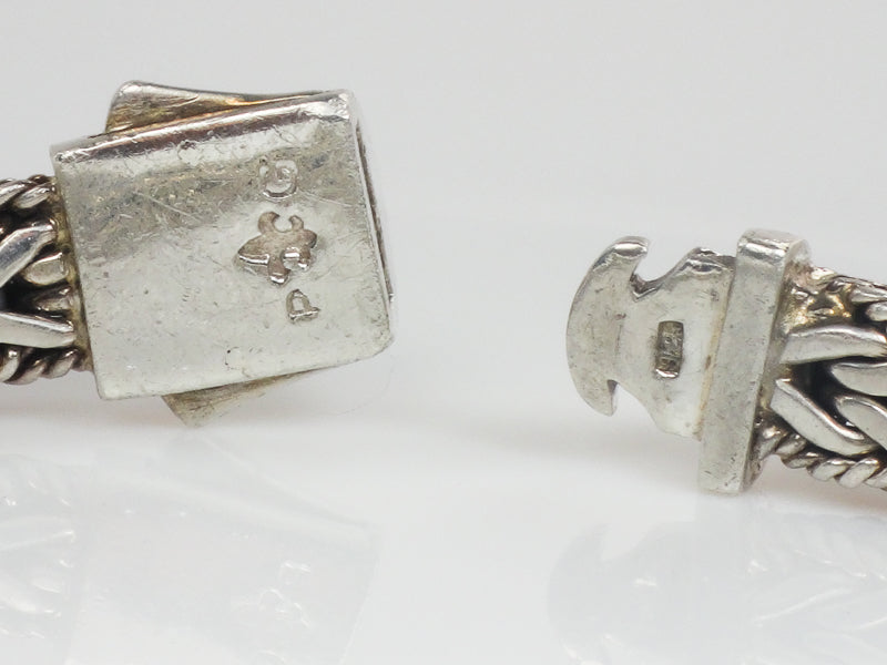 This Phillip Gavriel Sterling Silver Half Round Woven Chain Sapphire Bracelet is gorgeous! The woven style is a favorite and the black sapphire stones add to the look. A simple yet elegant bracelet to wear alone or layer with others. The bracelet measures approximately 8.5 mm north to south at the woven section and 6 mm in height. It is marked 925 (for sterling silver) and has the Philliip Gavriel mark of P fleur de lis G. The bracelet is pre-owned and is in good condition, ready to be worn and enjoyed. It's well made and substantial. A nice gift for a lady or a gift for yourself!